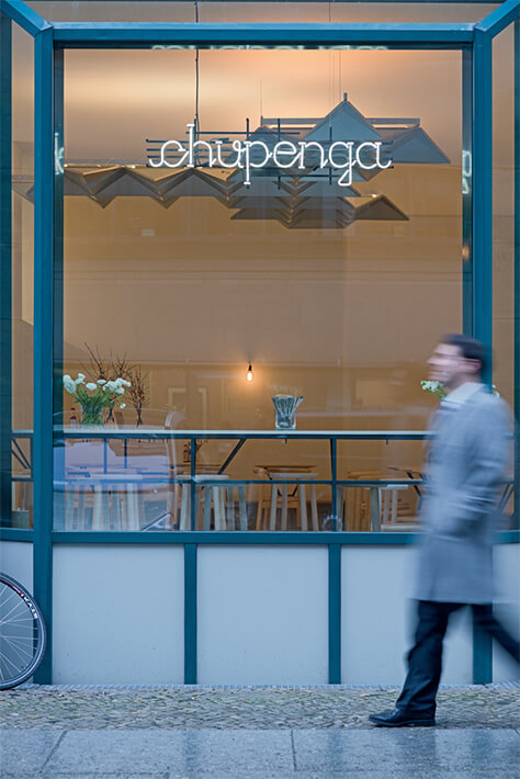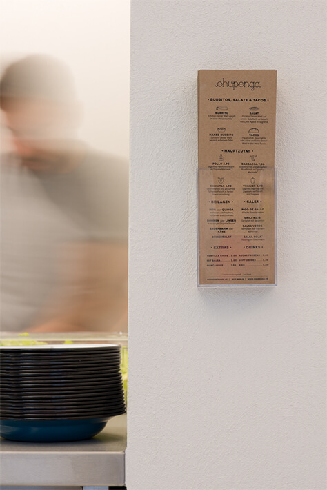 Planung eines neuen Restaurantkonzepts für den Chupenga Flagshipstore in Berlin am Gendarmenmarkt. Alle Gerichte des mexikanischen Imbiss-Restaurants werden direkt vor den Augen der Kunden nach individuellen Wünschen zubereitet. Die Menüs lassen sich beliebig kombinieren und bieten viele vegetarische bzw. vegane Optionen.